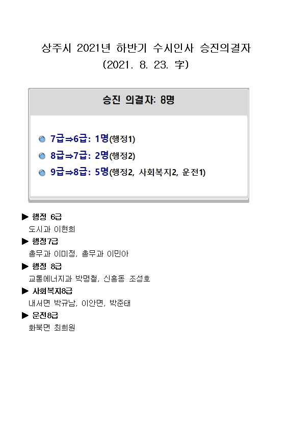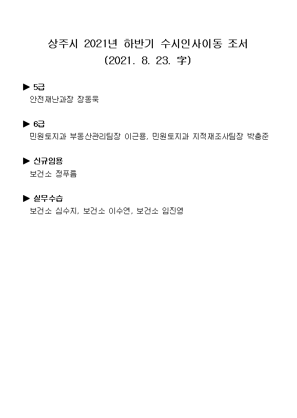 [상주=경북IT뉴스] 상주시는 2021년 하반기 수시인사 승진의결자 및 인사이동조서를 발표했다.