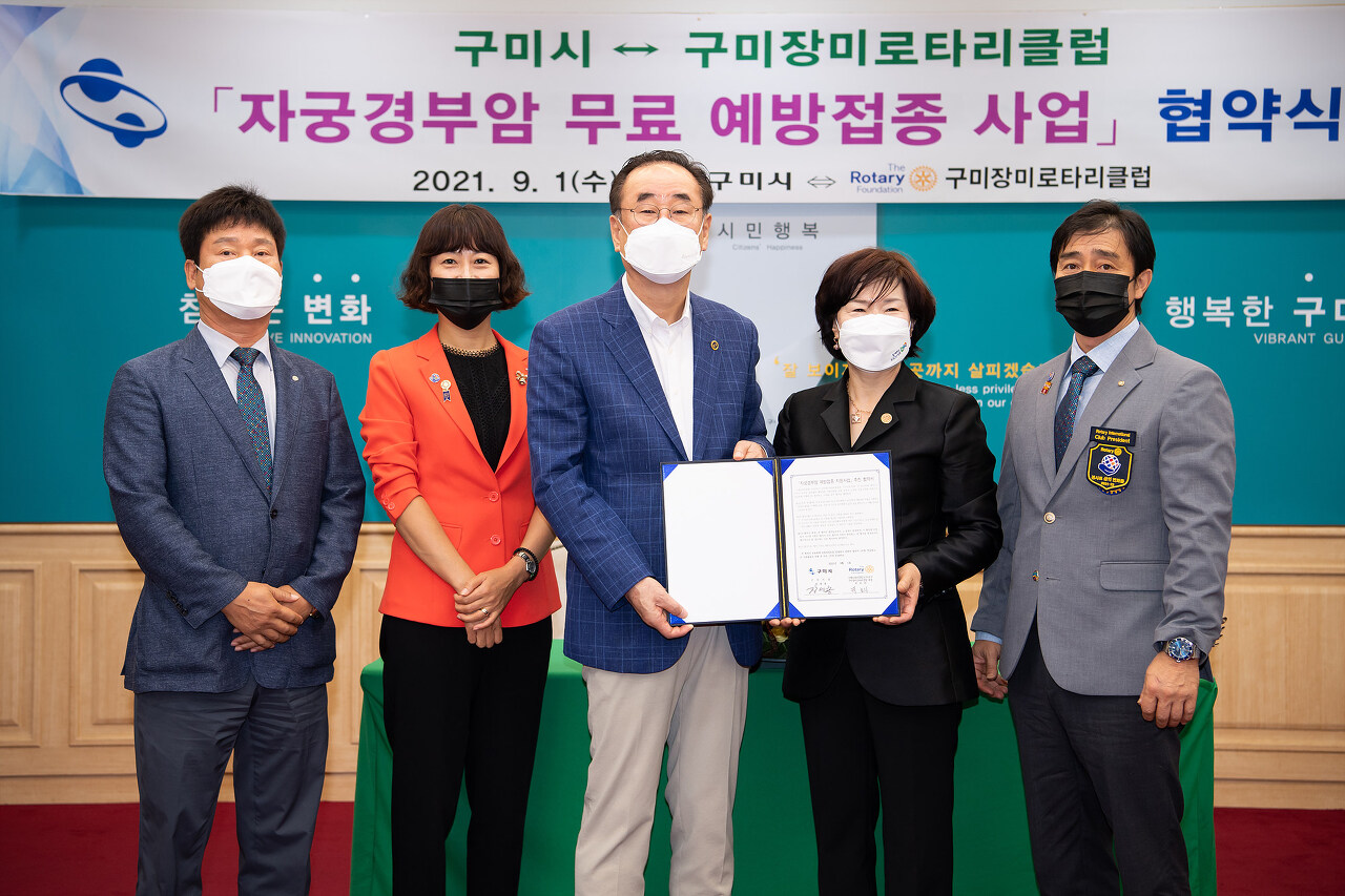 [구미=경북IT뉴스] 구미시는 지난 1일 시청 국제통상협력실에서 구미장미로타리클럽과 저소득 취약계층을 위한 자궁경부암 무료 예방접종 사업 협약을 맺었다.