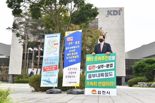 [김천=경북IT뉴스] 김천시의회 이우청 의장은 지난 6일 오전 세종시 한국개발연구원(KDI) 전정에서 중부내륙철도의 단절구간인 김천~문경 구간의 조속한 연결을 촉구하는 1인 피켓시위에 나섰다.