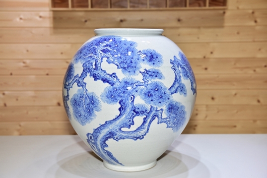 경품으로 나온 작품은 경북도 무형문화제 미산 김선식 명장의 청화백자 솔문 달항아리로 2018년산이다. 전형적인 달항아리 제작기법으로 관음리 가마에서 구운 작품이다.