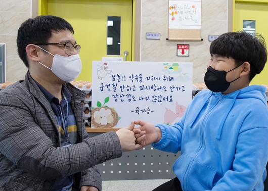 지승 군은 이 주무관을 찾아가 감사 인사를 전하며 게임기 금액인 40만 원을 모아 이번에도 어려운 이웃을 위해 달걀을 기부하겠다는 약속을 했다.