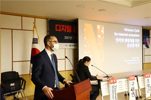 첫 발제에 나선 토마스 볼머 넷플릭스 디렉터는 “망 이용대가 이슈에 대해 법적 강제보다는 사업자 간 자율적 대가 협상이 중요하며, 기술적 조치와 CP와 ISP간 자율적 협업을 통해 이 문제를 해결하는 것이 바람직하다는 것이 넷플릭스의 입장이다”고 밝혔다.