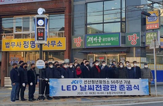이번 사업은 JCI선산청년회의소 50주년기념 사업의 일환으로 구미시 대기질 정보를 실시간 전달하는 미세먼지 알리미 신호등을 선산 농협 삼거리에 설치해 기부채납 한 것이다.