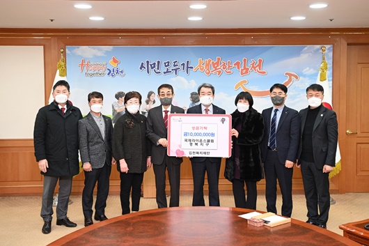 [김천=경북IT뉴스] 김천시는 국제라이온스클럽 356-E지구(총재 이영철)가 지난 7일 지역의 저소득층 가정과 소외된 이웃을 위해 성금 1천만원을 김천복지재단에 기탁했다고 밝혔다.