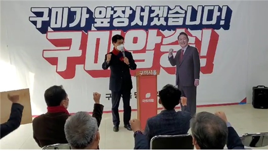 국민의힘 구미시을 당원협의회 회의실에서 지난 13일 (사)대한민국 서포터즈 봉사단과 대한통일산악회 회원들과 지역 시도의원 등 50여명은 ‘박근혜 서포터즈 김동렬 규탄 및 윤석열 후보 지지선언 대회’를 개최했다.