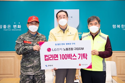 [구미=경북IT뉴스] LG전자 노동조합 구미지부(지부장 유정종)에서 2월 15일 구미시를 방문해 해병대 구미시전우회 봉사활동 참여자 간식으로 컵라면 100박스(180만원 상당)를 전달했다.