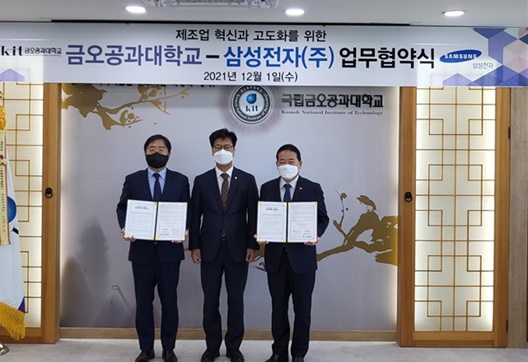 삼성전자-금오공대 MOU 체결 사진(2021.12.1.) | [구미=경북IT뉴스] 김영식 국회의원은 지난해 말 삼성전자 베트남 스마트폰 협력사 생산라인(2개)의 경북 구미 사업장 이전에 대해 환영한다고 밝혔다. 삼성전자가 제조 거점을 해외로 옮긴 후 구미 공장 생산라인을 확충한 것은 처음이기 때문이다.