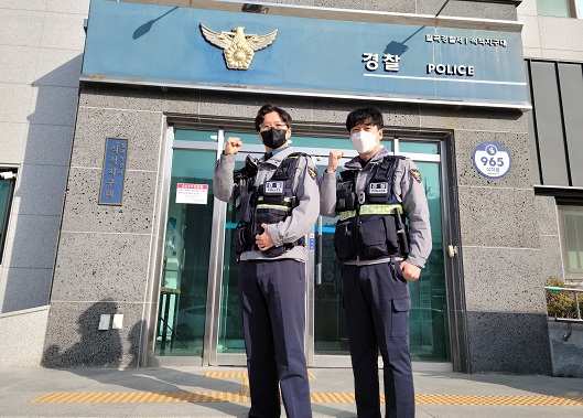허성민 경장·이상렬 순경(좌로부터) | [칠곡=경북IT뉴스] 칠곡경찰서 석적지구대는 지난 11일 저녁 7시 “아는 후배가 자살을 암시하는 메시지를 보냈다”는 신고를 받고 이상렬 경장과 허성민 순경은 자살기도자가 있을 것으로 추정되는 인근의 저수지로 급히 출동했다.