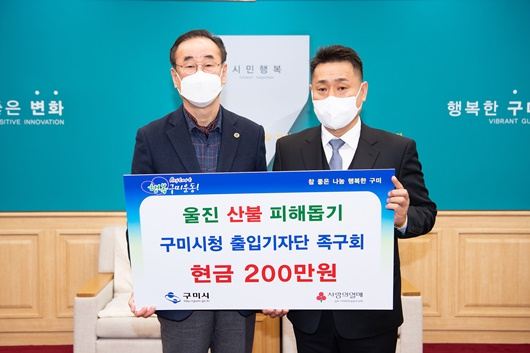 [구미=경북IT뉴스] 구미시(시장 장세용)에서는 22일 시청에서 구미시청 출입기자단 족구회(회장 장욱환)와 울진지역 산불 피해 이재민을 돕기 위한 성금(현금 200만원) 기탁식을 가졌다.