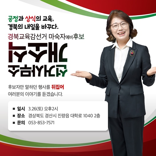 마숙자 경북교육감 예비후보는 “공정과 상식의 교육으로, 경북의 내일을 확! 바꾸겠다”라며, ‘교육감실의 문턱 없애기’와 ‘100년 관습과 관행의 벽 허물기’, 각 학교 특성에 맞는 ‘학교재생뉴딜사업’ 등을 제시했다.