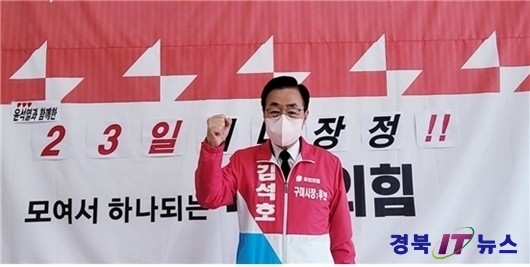 특히 김 예비후보는 “친환경 자동차 산업 생태계는 에너지 산업, 제조업과 서비스업, IT, 전기, 전자 및 부품 산업과 같은 모든 산업의 종합 예술”이라며 “전기자동차 완성 공장 유치로 구미가 얼마만큼의 경제적 이윤을 남길 수 있을지 감히 예측할 수 없을 규모”라고 강조했다. 또 “윤석열 당선인께서도 구미를 친환경 차량 산업의 거점 지역으로 마련하겠다고 말씀하신 만큼 이번 기회를 잘 활용한다면 구미의 경제적 위기를 극복할 수 있을 것”이라고 설명했다. 구미 공단에 기업 유치 방안에 대해 김 예비후보는 “구미 시정을 운영할 수 있는 기회가 온다면 모든 인적 네트워크를 동원함과 동시에 기업 유치 TF팀을 시장 직속으로 구성해 365일 24시간 기업 유치에 사활을 걸겠다”고 말헀다. 한편, 김석호 예비후보는 1998년 구미경제살리기 비상대책위 사무국장을 시작으로 구미상공회의소 상공의원, 대하합섬 대표, 밴스테크 대표이사, 금오산맥 대표이사, 구미산업수출진흥협회 회장 등을 역임하는 등 경제, 기업, 산업 분야의 전문가로 알려져 있다.