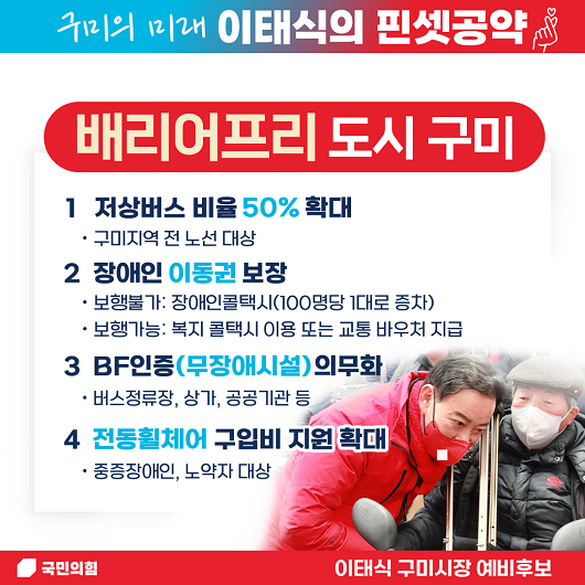 [구미=경북IT뉴스] 이태식 국민의힘 구미시장 예비후보는 19일, ‘배리어프리 도시, 구미’를 슬로건으로 장애인, 노약자 등의 사회적 약자를 위한 ‘배리어프리 핀셋공약’을 제시했다.