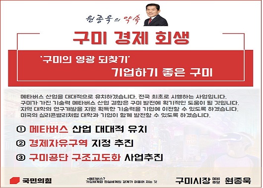 [구미=경북IT뉴스] 원종욱 구미시장 예비후보는 한국산업산단공단과 협의를 통해 대대적인 구미 1공단 구조고도화를 실시하겠다고 밝혔다.