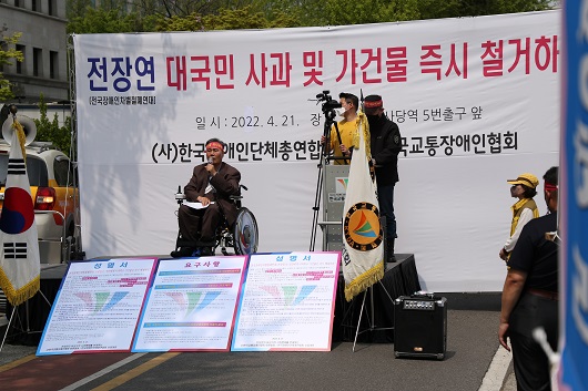 (사)한국장애인단체총연합회·(사)한국교통장애인협회, 전국장애인차별철폐연대 대국민 사과 및 가건물 즉시 철거 촉구 집회