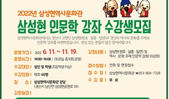 [경산=경북IT뉴스] 경산 삼성현역사문화관(관장 김도온)에서는 2022년‘삼성현三聖賢 인문학 강좌’수강생을 모집한다.  접수는 6월 10일까지 전화로 신청하면 되고, 수강료는 무료이다.
