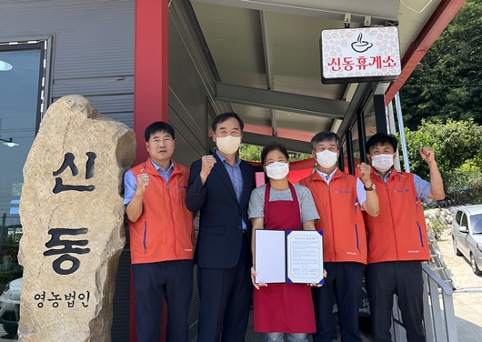 강호근 고아읍장(사진 좌2), 김종혁 위원장(사진 좌4) | [구미=경북IT뉴스] 구미시 고아읍에서는 지난 22일 고아읍 지역사회보장협의체 위원 등 10여명이 참여한 가운데 신동영농법인과 ‘구미행복 나눔가게’ 협약식을 가졌다.