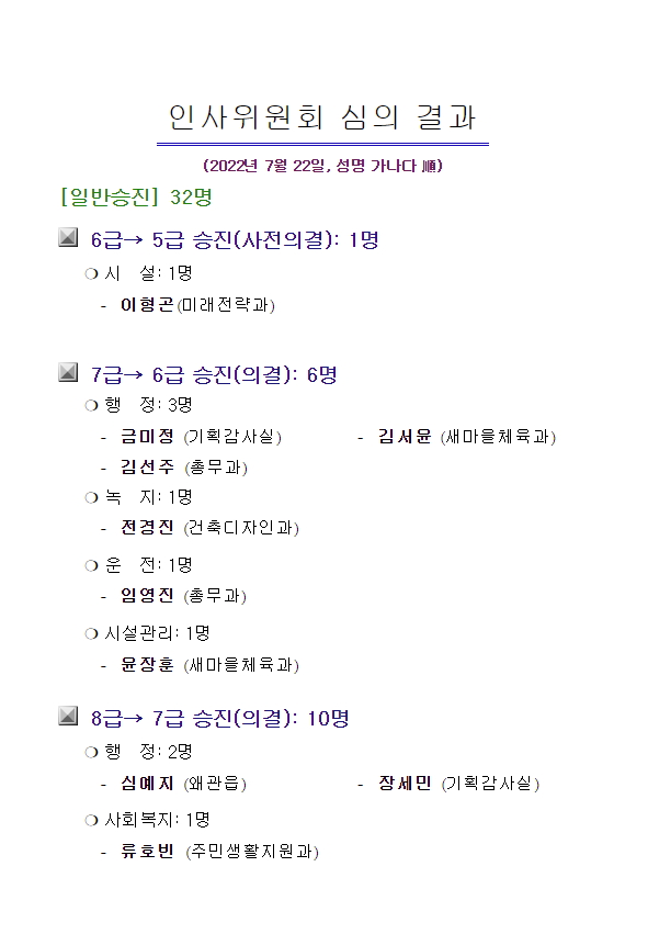 [칠곡=경북IT뉴스] 칠곡군(군수 김재욱)은 2022년 07월 22일자 총 32명에 대해 인사위원회 심의 결과를 발표했다.