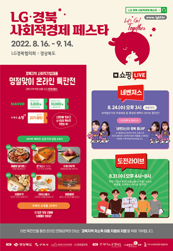 LG경북협의회는 경상북도 및 사회적기업 성장지원센터, 경북사회적기업협의회와 함께 지난 16일부터 9월 14일까지 약 1개월 간 LG·경북 사회적경제 페스타 온라인 특판전 행사를 진행한다.