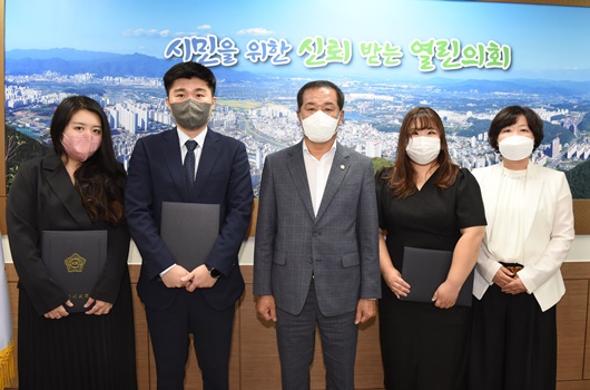[경산=경북IT뉴스] 경산시의회는 지난 22일, 의장실에서 정책지원관 3명에 대한 임용장 수여식을 개최했다.