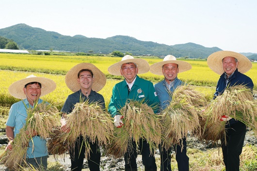 이날 김학동 예천군수를 비롯한 조생종 쌀 작목반 회원, 예천군농협쌀조공법인, 농정관계자 등 20여명이 참석해 첫 수확을 축하했다.