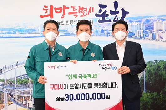 이강덕 포항시장은 “포항시를 위해 한걸음에 달려와 준 김장호 구미시장과 윤재호 구미상공회의소 회장에게 감사드리며, 이웃도시의 따뜻한 마음을 전해준 구미시민에게도 진심어린 고마움을 전한다”고 말했다.