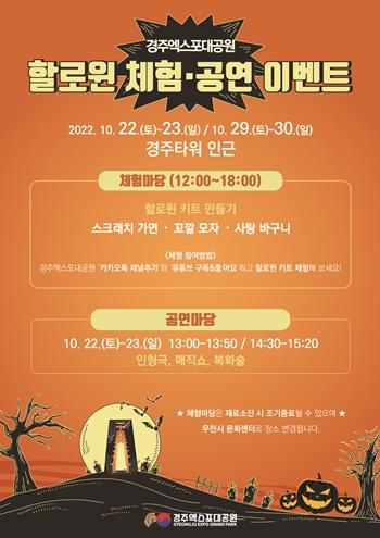 [경주=경북IT뉴스] 경주엑스포대공원은 는 22~23일과 29~30일 4일간 공원 내 경주타워 부근에서 할로윈 키트 만들기 체험마당과 인형극 마술쇼 등 공연마당 이벤트를 펼친다.