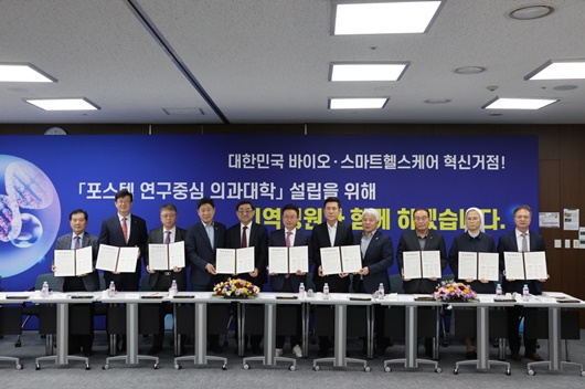 협약식에는 이철우 경북도지사, 이강덕 포항시장, 김무환 포스텍 총장, 포항지역 6개 병원장과 의대 설립 추진위원을 비롯한 30여명이 참석했다.