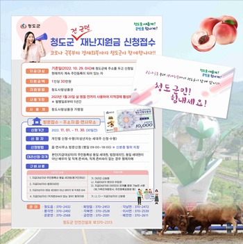 지급대상은 기준일(2022년 10월 29일 0시)에 청도군에 주소를 두고 신청일 현재까지 계속 주민등록을 둔 자로 오는 11월 1일부터 30일까지 30일간 신청 가능하다.