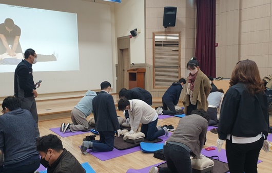 응급처치교육은 김천대학교 산학협력단 소속 응급구조 전문 강사를 초빙해 응급상황 발생 시 행동요령법을 시작으로 심폐소생술(CPR)과 자동심장충격기(AED)사용법에 대한 실질적인 체험 위주의 교육으로 진행됐다.