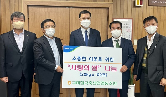[칠곡=경북IT뉴스] 구미칠곡축협(조합장 김영호)이 지난 10일 칠곡군청을 방문해 어려운 이웃들에게 전달해 달라며 쌀 2,000kg을 기부했다.