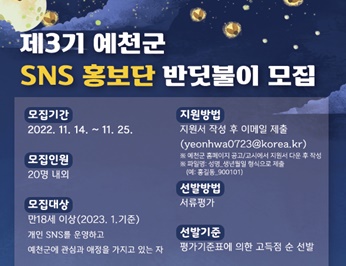 한편, 예천군은 2018년부터 SNS 홍보단을 운영하고 있으며 이번에 모집할 3기 SNS 홍보단 활동기간은 2023년 1월부터 2024년 12월까지 2년간 활동하게 된다.