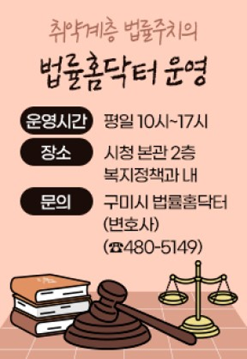 한편, 구미시 법률홈닥터는 시청 본관 2층 복지정책과 내 상근해 무료로 상담에 나서고 있다.