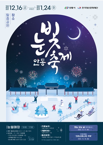 권기창 안동시장은 “이번에 첫선을 보이는‘안동 눈빛 축제’가 경북을 넘어 대도시 관광객들에게 사랑받으며 겨울 대표 축제로 거듭나길 기대한다”며 “관광거점도시 안동의 역량을 총결집해 마련한 이번 축제에서 즐겁고 행복한 추억을 남기길 바란다”고 말했다.