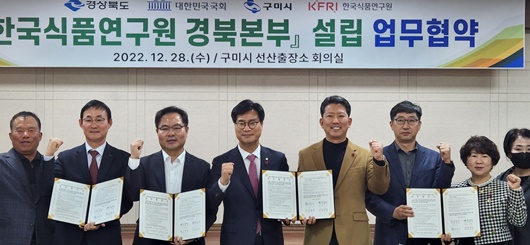 [구미=경북IT뉴스] 구미시 선산출장소에서는 지난 28일 김영식 의원을 비롯해 김학홍 경북도부지사, 김장호 구미시장, 백형희 한국식품연구원장이 참석한 가운데 한국식품연구원 경북본부 설립을 위한 업무협약(MOU)체결식이 열렸다.