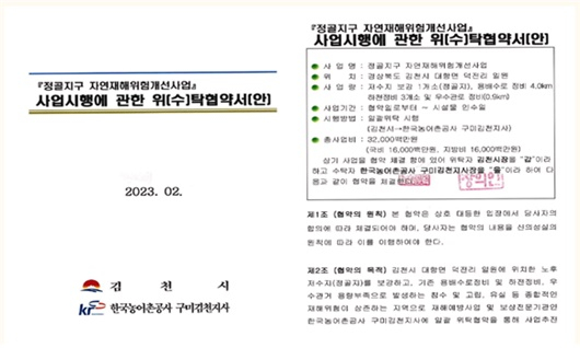 [구미=경북IT뉴스] 한국농어촌공사 구미·김천지사는 지난 13일 김천시와 정골지구 자연재해위험개선사업에 대해 일괄 위수탁 협약을 체결했다.