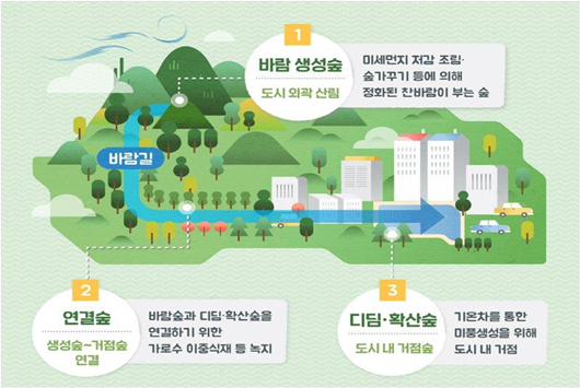 도시바람길숲의 원리는 밤낮의 기압차를 이용해 도시 외곽에서 조성한 숲이 생성하는 맑고 찬 공기를 연결숲을 만들어 도시 내부로 끌어 들이고, 도심에는 특성에 맞는 다양한 숲으로 녹화해 대기 순환을 통해 미세먼지 등 오염물질과 뜨거운 공기를 외부로 배출하는 기능의 생태 시스템이다.