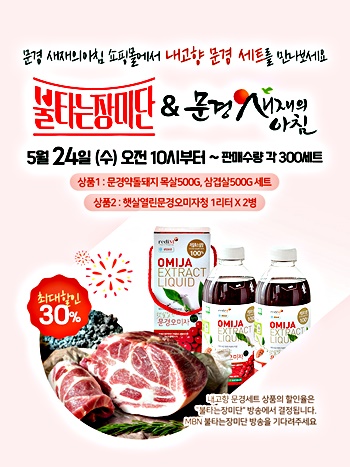 특히 방송이 종료된 다음 날인 24일 10시부터 문경새재의아침 쇼핑몰(https://mgmall.cyso.co.kr/)에서 문경약돌돼지와 문경오미자청 각 300set를 할인해 선착순 판매한다.