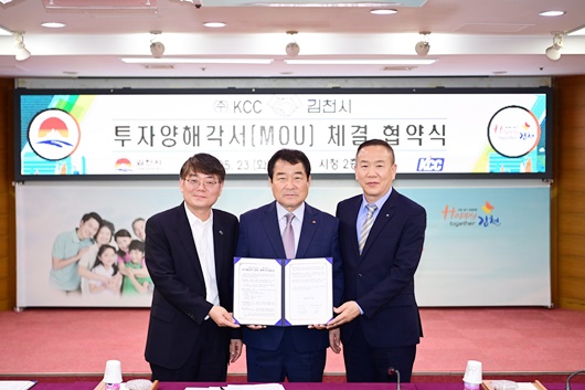 [김천=경북IT뉴스] 김천시는 지난 23일 시청 2층 회의실에서 김충섭 김천시장, ㈜케이씨씨 김홍겸 김천공장장, 안용우 김천상공회의소 회장 등 15명이 참석한 가운데 ㈜케이씨씨 김천공장 증설에 대한 투자양해각서를 체결했다.