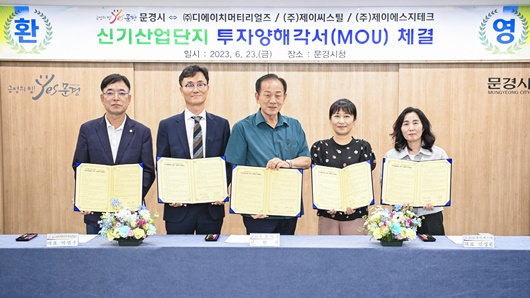 [문경=경북IT뉴스] 문경시는 지난 23일 시청 제2회의실에서 신기산업단지 내 신규 투자 업체 ㈜디에이치머티리얼즈 ㈜제이씨스틸 ㈜제이에스지테크 3사와 투자양해각서(MOU)를 체결했다.