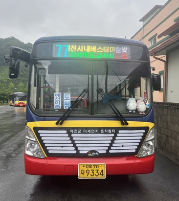 [예천=경북IT뉴스] 예천군은 미세먼지 저감에 선제적으로 대응하기 위해 경북도 최초로 미세먼지 흡착 필터를 버스 전면에 부착했다.