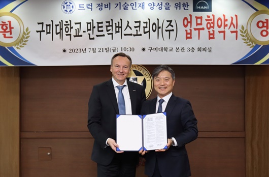 [구미=경북IT뉴스] 구미대학교(총장 이승환)는 지난 21일 본관 3층 회의실에서 만트럭버스코리아(주)(대표 토마스 헤머리히)와 전문 기술인재 공동 양성을 위한 산학협력 협약을 체결했다.