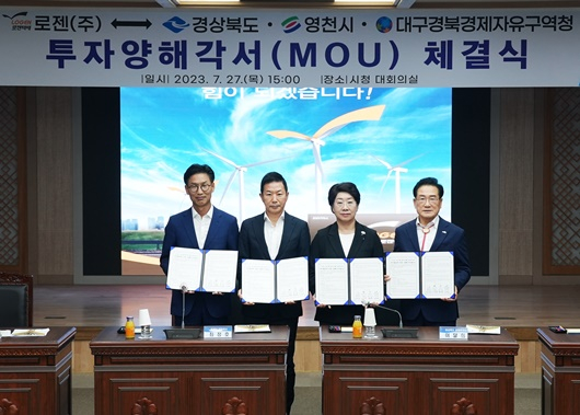 [경북=경북IT뉴스] 경북도와 영천시는 지난 27일 영천시청 대회의실에서 국내 4대 택배전문기업의 하나인 로젠 및 대구경북경제자유구역청과 함께 영천하이테크파크지구(경제자유구역) 내에 ‘물류시설 구축 투자양해각서’를 체결했다.