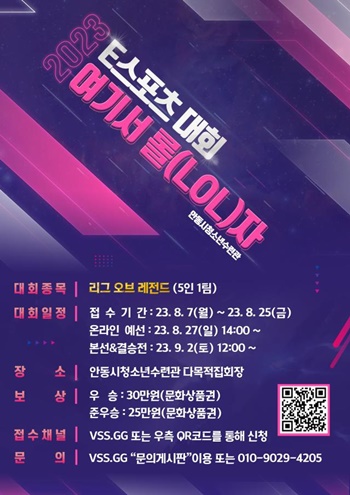 '리그오브레전드' 종목으로 진행되는 이번 대회는 안동시에 거주 또는 관내 학교에 재학 중인 12세 ~ 19세 청소년이라면 누구나 참여할 수 있다.