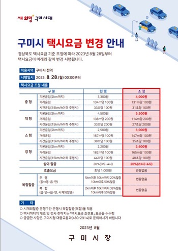 [구미=경북IT뉴스] 구미시는 오는 28일 0시부터 중형택시 기본요금을 4천 원으로 인상한다고 밝혔다.