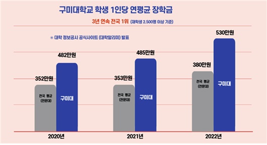 이로써 구미대는 2020년부터 2022년까지 최근 3년 연속으로 장학금에서 전국 전문대 (재학생 2500명 이상 기준) 1위를 차지했다.