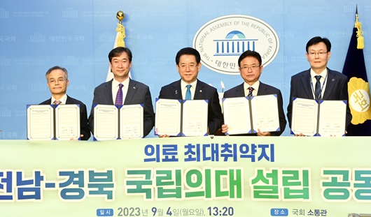 경북도와 전남도는 지난 4일 국회 소통관에서 정태주 안동대 총장, 송하철 목포대 총장, 박병희 순천대 의대설립추진단장과 함께 ‘의료 최대 취약지 경북·전남 국립의대 설립 촉구’ 대정부 공동건의문을 발표했다.