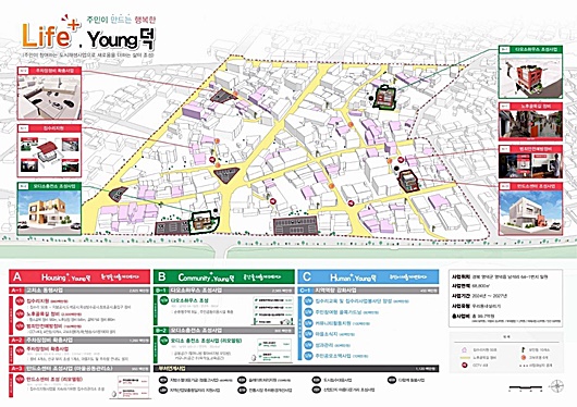 사업내용은 집수리 50호 지원, 공용주차장 65면 설치, 다목적 순환형주택 8호 조성, 주민 커뮤니티 공간 설치 등 생활환경 개선을 통한 주거복지 및 영덕 주민들의 삶의 질을 개선하고, 신규 일자리 창출을 통한 지역민들의 소득 증대에 큰 기대를 모으고 있다.