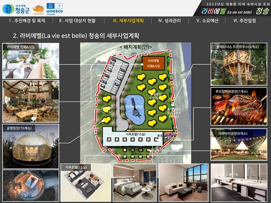 사업규모는 총사업비 100억 원으로 건축설계를 공모해 2026년 상반기 준공을 목표로 가족형호텔 15실(1,840㎡), 청송사과 글램핑장 15개소(630㎡), 바비큐장 15개소(240㎡), 트리하우스 4개소(100㎡), 라비에벨 카페&식당 256㎡, 야외물놀이장, 주차장 등 주요시설로 조성하여 호텔의 편안함과 캠핑의 즐거움, 그리고 산소카페 청송군의 아름다운 자연을 느낄 수 있는 전국에서 유일한 최고의 이색숙박시설을 조성할 계획이다.