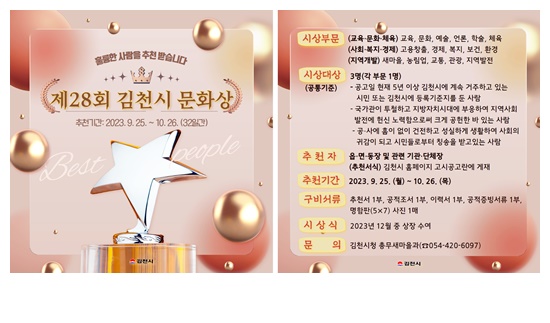 [김천=경북IT뉴스] 김천시는 25일부터 10월26일까지 ‘제28회 김천시 문화상’ 수상 후보자를 공개 추천받는다.