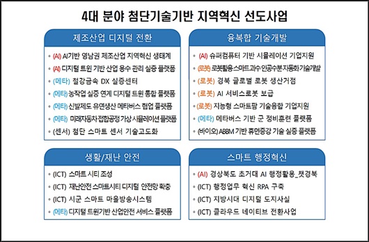 첨단기술기반 지역혁신 선도 신규사업은 제조산업 디지털 전환, 융복합 기술개발 지원, 생활 및 재난 안전, 스마트 행정혁신 등 4대 분야 22개 사업이다.